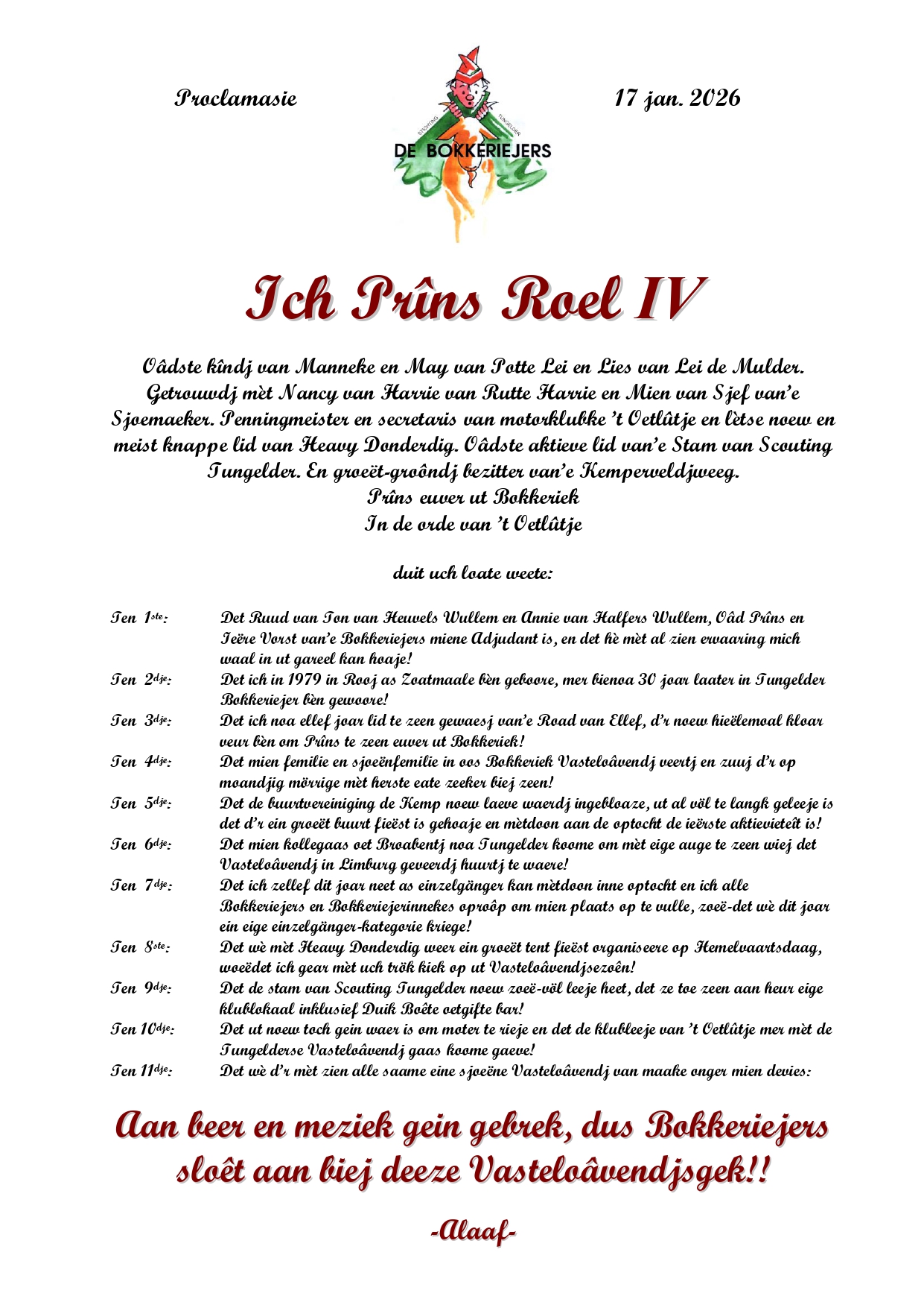 "Aan beer en meziek gein gebrek, dus Bokkeriejers sloêt aan biej deeze Vasteloâvendjsgek!!"